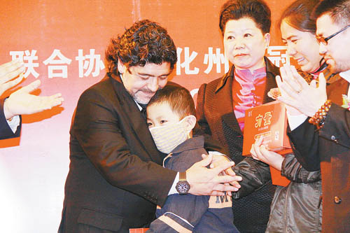 球王马拉多纳在北京深情拥抱并亲吻一名癌症患儿(图)