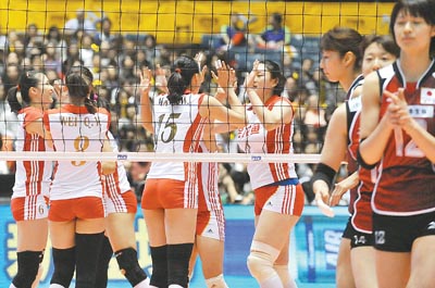 11月6日,中国女排在日本东京举行的女排世锦赛上,以3∶1战胜日本队。图为中国女排选手在得分后击掌相庆。