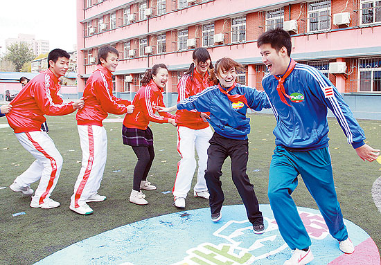 11月7日,网友们在做“老鹰捉小鸡”的游戏。当日,来自天津的200多名网友齐聚天津大学附属小学参与一场名为“生活如此多娇”的经典游戏回顾游艺活动。众多“80后”、“70后”甚至“60”后一起做广播体操,玩集体跳绳、丢手绢等儿时游戏,在活动中舒缓生活的压力,追忆童年的欢乐。刘东岳摄(新华社发)
