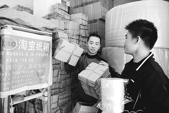 11月4日,义乌青岩刘村的网商在本村采购邮寄产品用的包装纸箱、胶带等物品。