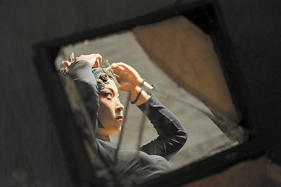 11月6日,山西永济韩阳镇,一名女演员上妆的影子映在一面破裂的镜子里。秋忙之后,当地乡村开始排演传统的蒲剧大戏。刘宝成摄
