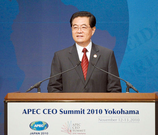 中国和世界在经济全球化进程中已经形成利益交融的局面。中国越发展,给世界带来的机遇和作出的贡献就越大。中国巨大的市场容量、不断完善的基础设施、日臻完备的产业配套能力、公平竞争的市场环境正在吸引越来越多跨国企业到中国投资兴业,也为亚太工商界提供了更多商机。我们欢迎亚太工商界人士积极参与中国改革开放和现代化进程,共享中国繁荣进步带来的机遇和成果。中国愿同各方携手努力,共同规划和建设人类更加美好的明天!
