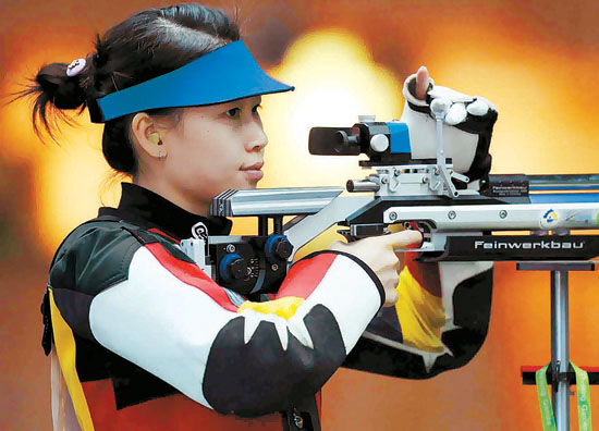 11月13日,易思玲在比赛中。当日,在第16届亚运会射击女子10米气步枪个人决赛中,中国选手易思玲夺得冠军。新华社记者 公磊摄