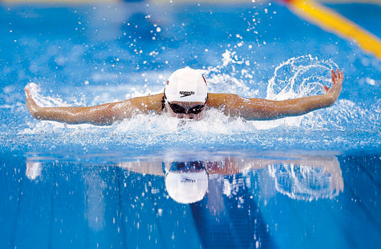 11月13日,中国选手焦刘洋在比赛中。当日,在广州奥体游泳馆举行的第16届亚运会女子100米蝶泳决赛中,焦刘洋以57秒76的成绩夺得冠军。新华社记者 费茂华摄