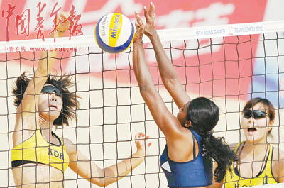 11月19日,在广州亚运会沙滩排球女子组的比赛中,韩国队的善花、美正以2∶1战胜斯里兰卡队的利娜、拉拉妮。