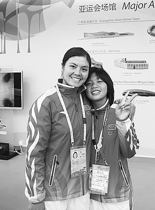 夏诗颖(右)和她的随队老师。 亚运会注册大学生记者 温融摄