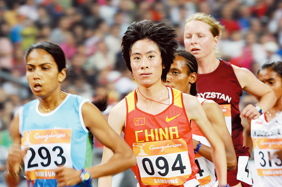 11月21日,在广州奥林匹克中心体育场举行的第16届亚运会女子10000米决赛中,白雪以32分39秒13的成绩获第八名。 新华社记者 李钢摄