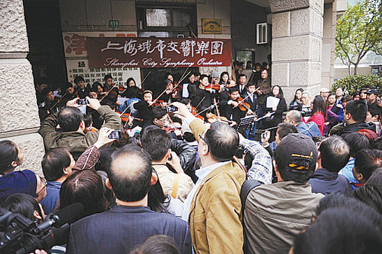 这是一场业余的交响乐演奏,参与者有学生、白领以及从外地赶回来的生意人。他们没有制服,穿着西装、夹克衫、黑色呢子大衣,拥挤着站在上海市胶州路边的4条台阶上。