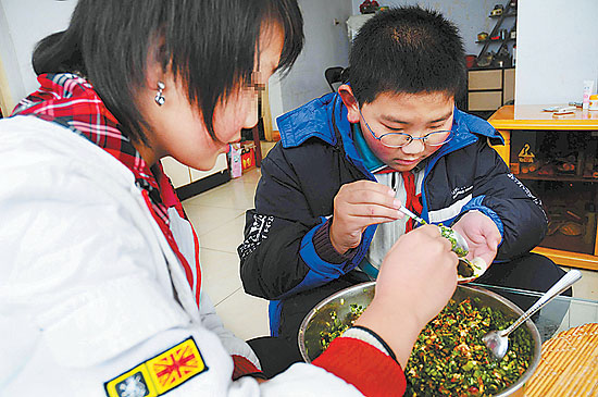 11月27日,一名艾滋孤儿(左)教河南省南阳市第十六小学的学生包饺子。