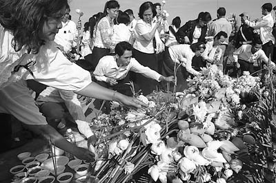 人们在柬埔寨首都金边钻石桥为踩踏事件的死难者祈祷