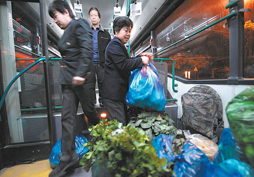 11月28日清晨,菜农龚玉玲(右)乘坐公交车,抵达位于杭州主城区的叶青兜农贸市场附近。从11月26日起,杭州各大农贸市场陆续推出“平价菜”,对指定的农产品实行微利出售,为市民菜篮子“减负”。记者跟踪拍摄,记录杭州城郊一家自产自销的菜农,从菜地收割青菜后,坐公交车到城区农贸市场平价销售青菜的过程。许多菜农的“微利”销售,带动了杭州农贸市场菜价的普遍下调。