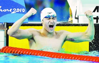 11月18日,广州亚运会男子1500米自由泳决赛中,中国选手孙杨力压韩国选手朴泰桓获得冠军,以14分35秒43的成绩打破亚洲纪录,离世界纪录不到1秒。参加比赛经常激动流泪的孙杨,这次迎来酣畅的胜利。