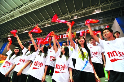 亚运志愿助威团成员挥动志愿彩为运动健儿加油呐喊助威。本报记者 林 洁摄 |