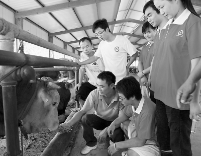 今年8月21日,安徽科技学院动物医学专业的大学生,来到安徽省凤阳县的一家种牛养殖基地,开展社会实践活动,为当地养牛专业户排忧解难。 汪 强摄(资料图片) |