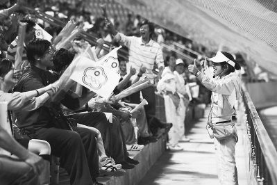 11月13日,亚运会棒球赛场,中华台北队小组赛中迎战韩国队,志愿者组织观众为中华台北队加油。本报记者 陈 剑摄 |