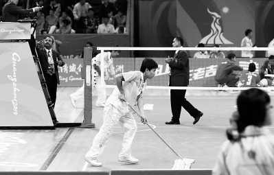 亚运会藤球赛场,志愿者在比赛间隙清洁场地。本报记者 陈 剑摄 |