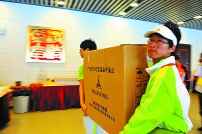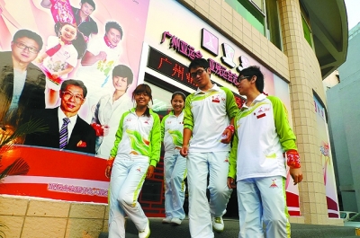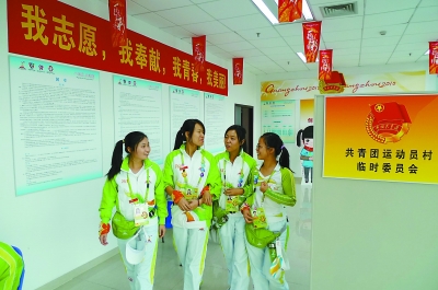 在亚运城运动员村,临时团支部成立了,团员们佩戴团徽上岗,“创先争优”活动如火如荼进行着。本报记者 林 洁摄 |