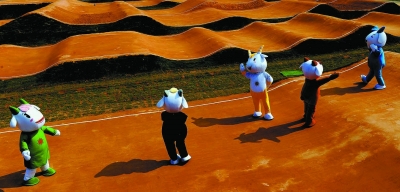 11月19日,由广东中医药大学学生扮演的广州亚运会吉祥物乐羊羊,在小轮车比赛现场与观众互动。本报记者 刘占坤摄 |