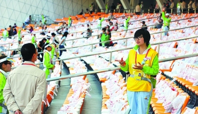 然而,对59万名亚运志愿者来说,绝大多数时间,他们是在平淡、甚至枯燥的岗位上渡过的,一句同样的话,每天要重复上千遍,一个同样的动作,每天要做上千遍。他们付出的汗水并不会比场上的运动员少,有的时候甚至更苦更累。由于穿着统一的服装,很多时候,即使他帮助过你,你也很快就忘掉他的面孔,留在记忆里的,或许只是一个温婉的微笑,一个小草一样青绿色的身影。