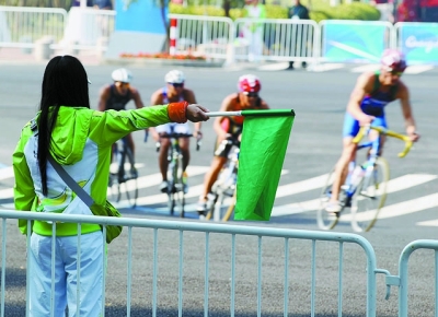 11月14日,铁人三项赛场,志愿者为运动员指示赛道方向。 本报记者 陈 剑摄 |