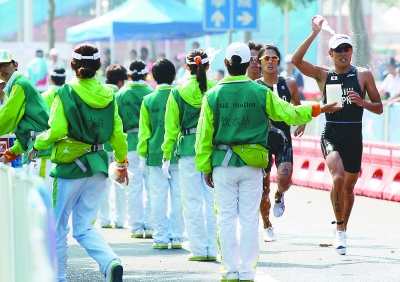 11月14日,广州大学城铁人三项赛场,志愿者排成一队为参赛运动员递水和吸水海绵。或许没有多少人能记住他们的具体名字和长相,但经历亚运的人都不会忘记他们的笑脸和那片充满生机的绿色。本报记者 陈 剑摄 |