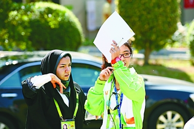 11月13日,亚运会射击赛场,一名志愿者为来自西亚的运动员指路。本报记者 陈 剑摄 |