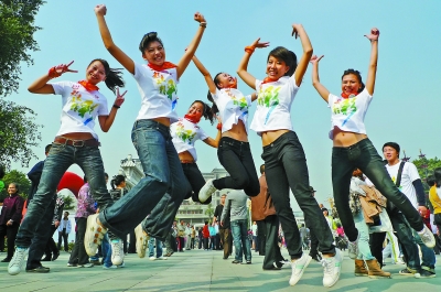 志愿者们在场馆外一起跳跃,展示青春活力。本报记者 林 洁摄 |