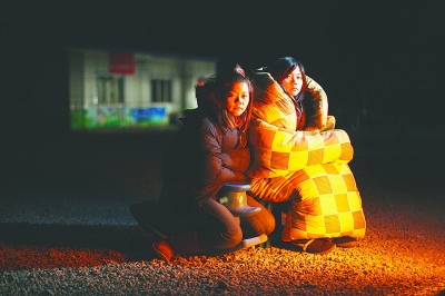 11月17日,青海玉树,香港双胞胎志愿者林家慧、林家欣在零下15摄氏度的寒夜里裹着被子取暖。