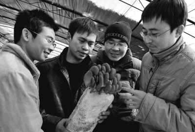 姚飞(右二)和王雪辉(左二)在给到种植场实践的两个师弟讲解蘑菇种植经验(12月15日摄)。今年7月,王雪辉和姚飞从延安大学生物科学专业毕业。因为大学期间一直在学校的生物菌实验室学习,每个假期又在延安川口乡的蘑菇种植基地实习,对于蘑菇种植已经有了一定经验,两人决定接手转让的川口乡蘑菇种植基地,开始自己创业。