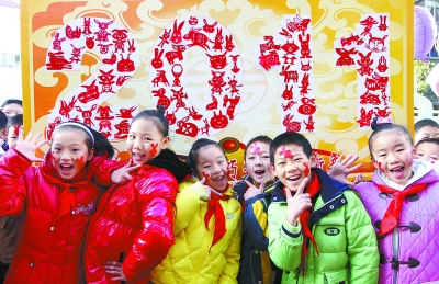 左图:12月31日,江西省九江小学的学生在他们制作的“2011”剪纸横幅前留影。
