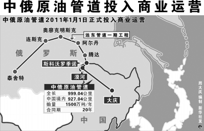 从2011年1月1日起,中俄双方将正式履行每年1500万吨原油进口协议,共持续20年。中俄原油管道起自俄罗斯远东原油管道斯科沃罗季诺分输站,穿越中国边境,途经黑龙江和内蒙古,止于黑龙江大庆末站,管道全长近1000公里,设计年输油量1500万吨,最大年输量3000万吨。中俄原油管道俄罗斯境内管道长约65.5公里,穿越两国界河黑龙江的管道长1.1公里,穿越出土点至漠河首站管道长7.4公里,中国漠河至大庆末站原油管道长925公里。