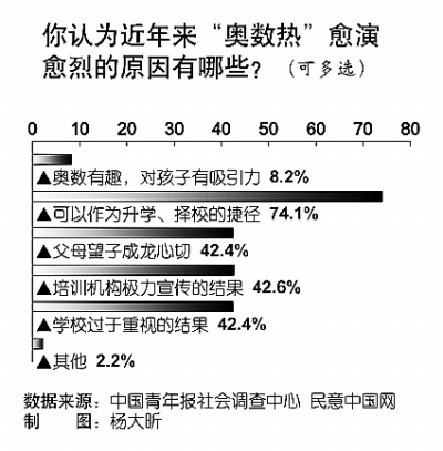 调查中,“奥数可以作为升学、择校的捷径”(74.1%),被公众视为“奥数热”愈演愈烈的首因。其他原因还有:“培训机构极力宣传的结果”(42.6%)、“父母望子成龙心切”(42.4%)、“学校过于重视奥数的结果”(42.4%)等。仅8.2%的人认为“奥数热”的原因是“奥数有趣,对孩子有吸引力”。