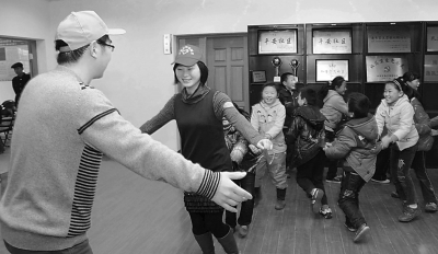 3月12日,江苏无锡南长区金城社区的大学生村官与农民工子女一起做游戏。