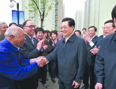 胡锦涛在保障性住房小区秋怡家园亲切看望居民,了解他们的住房改善情况。