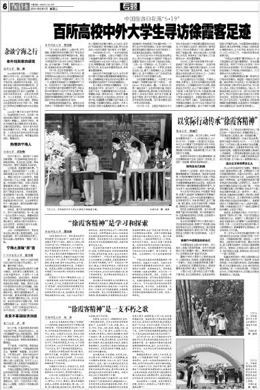 5月19日,在往年是普通的一天,从今年开始这个日子将不再平凡。今年3月30日,国务院常务会议通过决议,将《徐霞客游记》开篇日5月19日定为“中国旅游日”,而为了这一天,徐霞客开游地浙江宁海整整呼吁了10年,并成功举办了八届中国徐霞客开游节。在今年的第九届中国徐霞客开游节,来自全国100所高校的150名中外大学生齐聚宁海,参加由中国青年报社、宁海县人民政府与中国高校传媒联盟等共同举办的“2011年百所高校大学生寻访徐霞客足迹”活动。