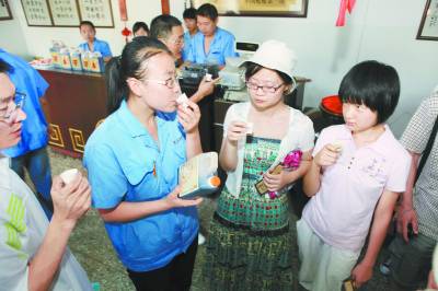 2011年8月9日,在山西太原东湖醋园卖场,一名负责人在向顾客讲解山西老陈醋的制作工艺后当众喝醋,讲述纯粮酿造醋的口感,回击近日在中国内地热议的山西老陈醋“勾兑”事件。
