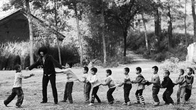 2010年5月11日,河南内乡县庙北村李家营。没有体育设施,张彩青老师就带领孩子们玩游戏。庙北村是赤眉镇最偏僻的穷山村。