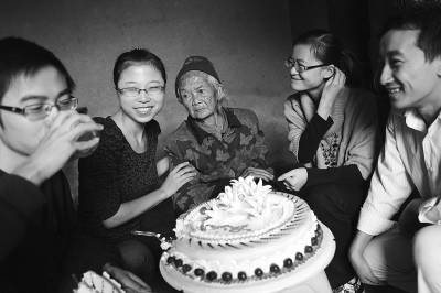 9月27日,重庆市大足县邮亭镇烈火村23组,4名大学生村官来到110岁高龄的老人徐恩玉家中,送来食用油、牛奶等,帮老人梳头、捶背、聊天,一起吃节日蛋糕。 罗国家 CFP供图