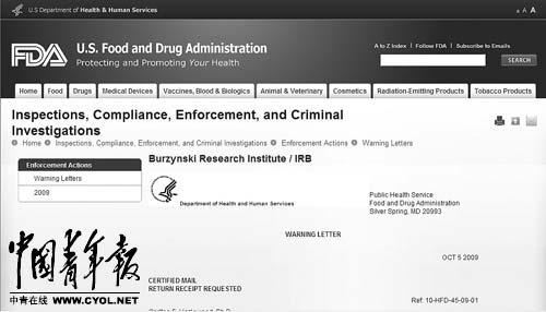2009年10月,美国食品药品监督管理局向博金斯基研究所的伦理委员会签发了警告信。本报记者 田国垒制图