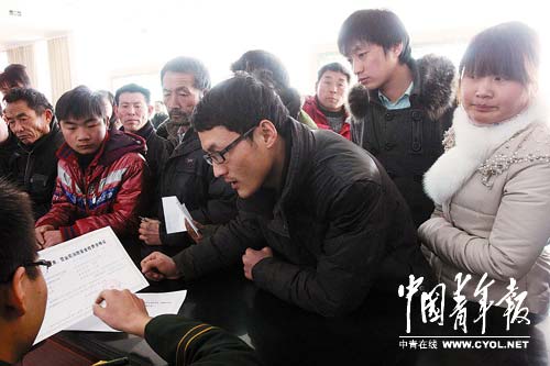 2月3日,和临泉县相邻的太和县,在县政府行政服务中心,师孝在向工作人员咨询创业相关事宜(下图)。1999年,师孝从重庆工商大学毕业后就一直在外地打工,去年他回到老家太和,和几个朋友一起筹资开了一家经销工程器械的公司。