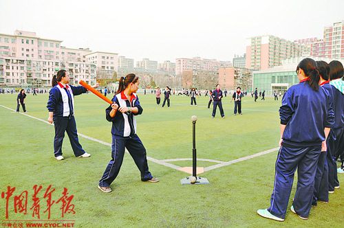 上周三下午4时15分,北京市汇文中学全天最后一节课的上课铃声响起,30多名高二女生来到学校田径场集合,摆在她们身边的是几支彩色的球棒和一筐海绵球。体育老师赵颖把学生分成四组,其中两组学生打软式垒球对抗赛,另两组继续练习软式垒球的基本动作。被分在打对抗赛一组的学生一片欢呼。