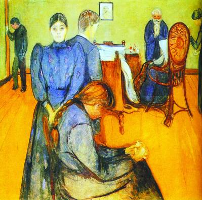 1877年,14岁的蒙克失去了心爱的姐姐。1894年,31岁的蒙克画了《病房中的死亡》,再现了姐姐索菲亚死亡时的场景。