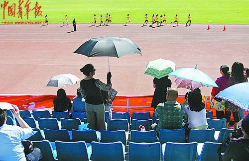 5月4日,2012年北京市东城区体育中考的第二天,上午9点,骄阳已经开始炙烤大地,北京奥体中心田径场内,作为考场的大部分内场区域尚处在阴凉中,考生们分别在进行800米或1000米长跑、篮球障碍运球、引体向上和仰卧起坐或掷实心球的考试,一切井然有序。与考场内的平静相对应,观众席上却是喊声震天——这里因烈日的直射而高温难耐,却挡不住数百名考生家长情绪激昂地为孩子们加油助威。每个孩子从检录到考试完毕至少要一个小时,不少家长就站在观众席上助威一个小时。