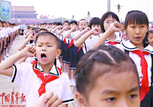 6月1日,7岁的江雨航(左一)和哥哥姐姐们一起在北京天安门广场英雄纪念碑前宣誓。这一天,他和近千名小朋友一起加入了中国少年先锋队。当天,北京市举行“红领巾心向党——学先锋,找榜样,争四好”主题队日活动。