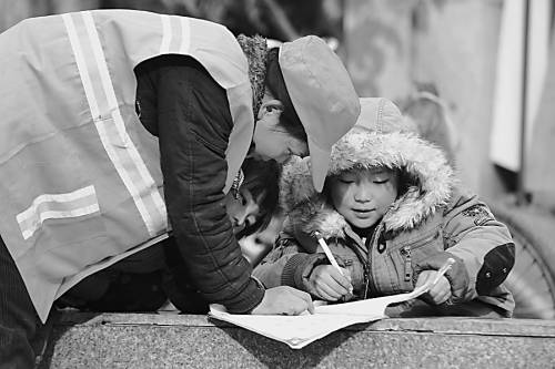 近日,西安环城南路,温均岭正在给7岁的儿子陈健博辅导作业,5岁的女儿一直在旁边看着。