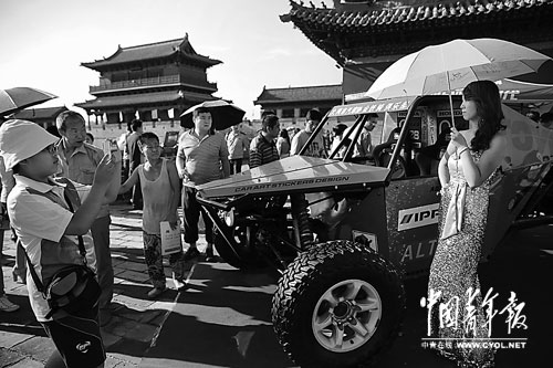 8月23日,山西省大同市南城墙上,几位游人围绕在一辆自制的专用沙漠赛车旁端详,同类型的这种进口赛车每辆售价高达800多万元。当天,第二届大同国际汽车文化节在这里开幕,几十款全球顶级豪车和经典老爷车亮相古城墙。