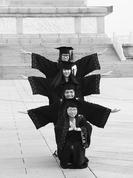 近日,北京天安门广场,来自北京各大学即将毕业的学子们摆出萌态十足的各种创意造型、拍照留影。
