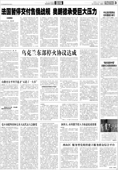 9月3日晚,法国总统府对外宣布法国将“暂停”原定于10月向俄罗斯交付第一艘西北风级两栖战舰。就在乌克兰和俄罗斯似乎已就走出危机达成某种默契之际,在北约于英国威尔士召开峰会的前夜,法国这一“突如其来”的决定颇耐人寻味,受到国际社会的广泛关注。