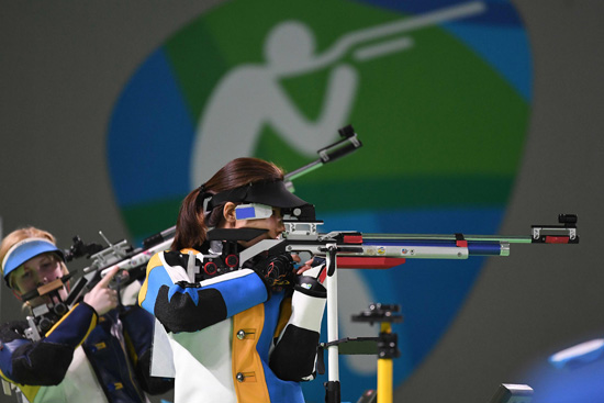 当地时间8月6日,在里约奥运会女子10米气步枪决赛中,美国选手维·思拉舍夺得冠军,中国选手杜丽、易思玲分获银牌和铜牌。图为杜丽在比赛中。视觉中国供图