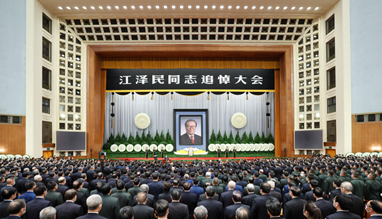 在全场凝重的气氛中,习近平致悼词。习近平在悼词中高度评价了江泽民同志光辉的一生和建立的丰功伟绩。他指出,从党的十三届四中全会到党的十六大的13年中,国际形势风云变幻,我国改革开放和社会主义现代化建设进程波澜壮阔。在国际国内十分复杂的形势下,江泽民同志带领党的中央领导集体,高举马克思列宁主义、毛泽东思想、邓小平理论伟大旗帜,坚持党的基本路线不动摇,紧紧依靠全党全军全国各族人民,坚定不移坚持和发展中国特色社会主义。江泽民同志深刻洞察世界新军事变革的发展趋势,主持制定了新时期军事战略方针,强调要推进中国特色军事变革,坚定不移走中国特色的精兵之路,加强人民军队革命化、现代化、正规化建设。在江泽民同志亲自领导和大力推动下,我国国防和军队现代化建设取得了巨大成就。江泽民同志集中全党智慧创立了“三个代表”重要思想,进一步回答了什么是社会主义、怎样建设社会主义的问题,创造性回答了建设什么样的党、怎样建设党的问题,深化了我们对新的时代条件下推进中国特色社会主义事业、加强党的建设的规律的认识,以新的思想、观点、论断,继承、丰富、发展了马克思列宁主义、毛泽东思想、邓小平理论。